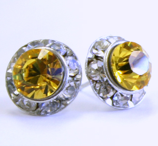 ![]() ITEM # AR122 CRYSTALLIZED™ SWAROVSKI ELEMENTS, Round Stones, 1028 XILION Chaton or 1122 Rivoli Stones with platinum foiling Color: Topaz Colour Code: 203 Swarovski Crystal With Crystal Channel Stud Earrings These stud earrings are bezel set in silver A brilliant round Topaz bezel set surrounded by channel set round crystals. Superior Quality Approximately 11mm in diameter with post closure (ul/ce84(m)p/ah-d/br) sold by each piece |